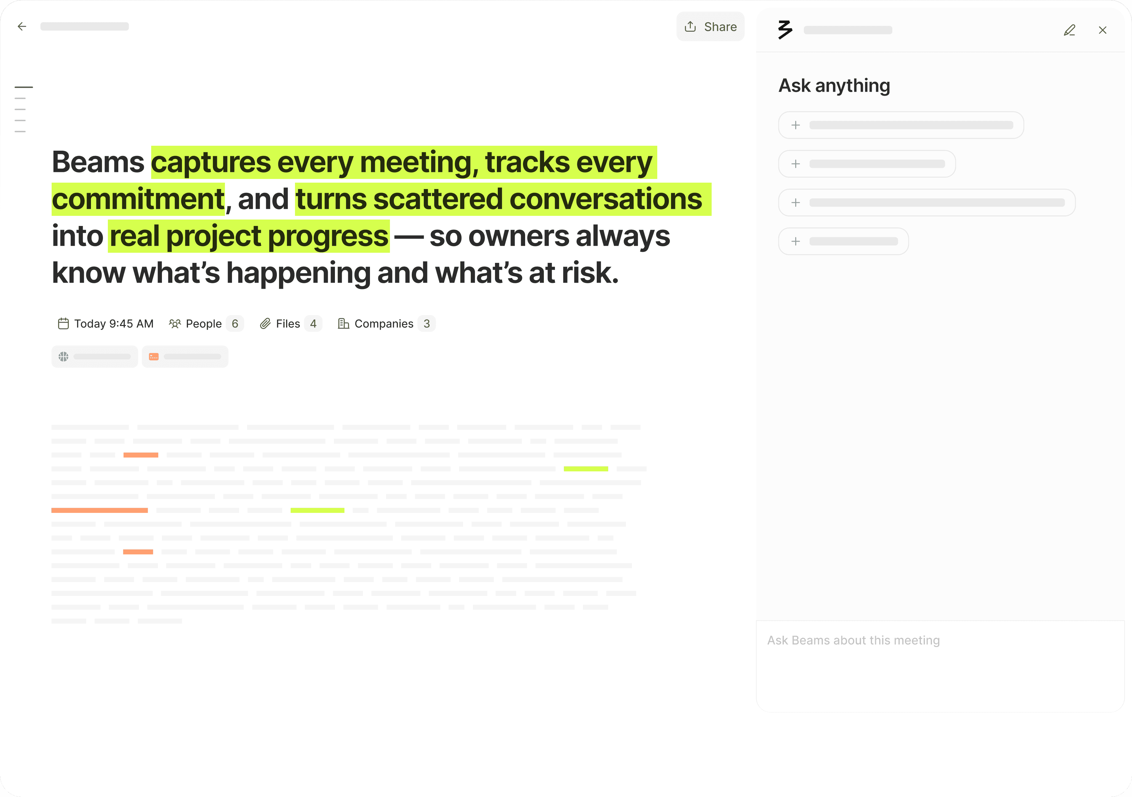 Beams takes notes for you—fast, accurate, effortless. Transform discussions into insights and actions.